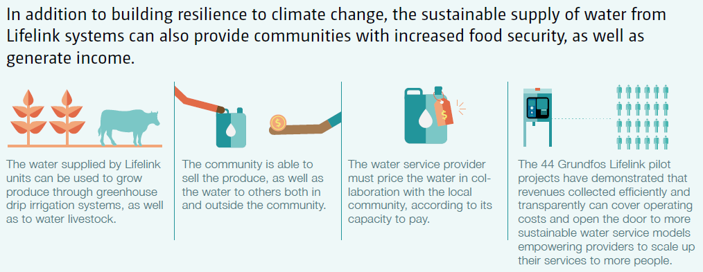 In addition to building resilience to climate change, the reliable supply of water from Lifelink systems can also provide communities with increased food security, as well as generate income. The water supplied by Lifelink units can be used to grow produce through greenhouse drip irrigation systems, as well as to water livestock. The community is able to sell the produce, as well as the water to others both in and outside the community. This allows the community to generate income, which it can invest in other adaptive measures towards climate change.