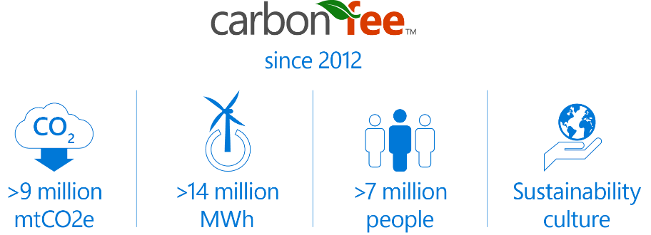 Since implementing its carbon fee in July 2012, Microsoft has reduced its emissions by more than 9 million metric tons of carbon dioxide equivalent (mtCO2e), invested in more than 14 million megawatt-hours (MWh) of green power, and has had a positive impact on more than 7 million people through carbon offset community project investments.
