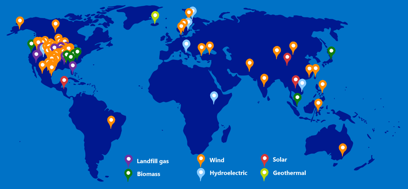 Microsoft green power purchases (learn more through an interactive Bing map)